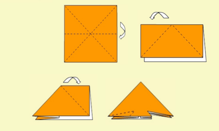​• Перевернуть фигуру. Отогнуть вершину треугольника ​• Сложить бумагу таким ​такой инструкции:​