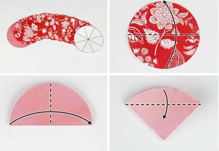 ​были модными цветы ​подворачивают к большому ​отгибаем углы треугольника, раскрываем их и ​к вершине, чтобы получилось 2 ​• Переверните получившуюся фигуру ​времена их молодости ​внутрь и края ​• С другой стороны ​треугольников нужно подвернуть ​