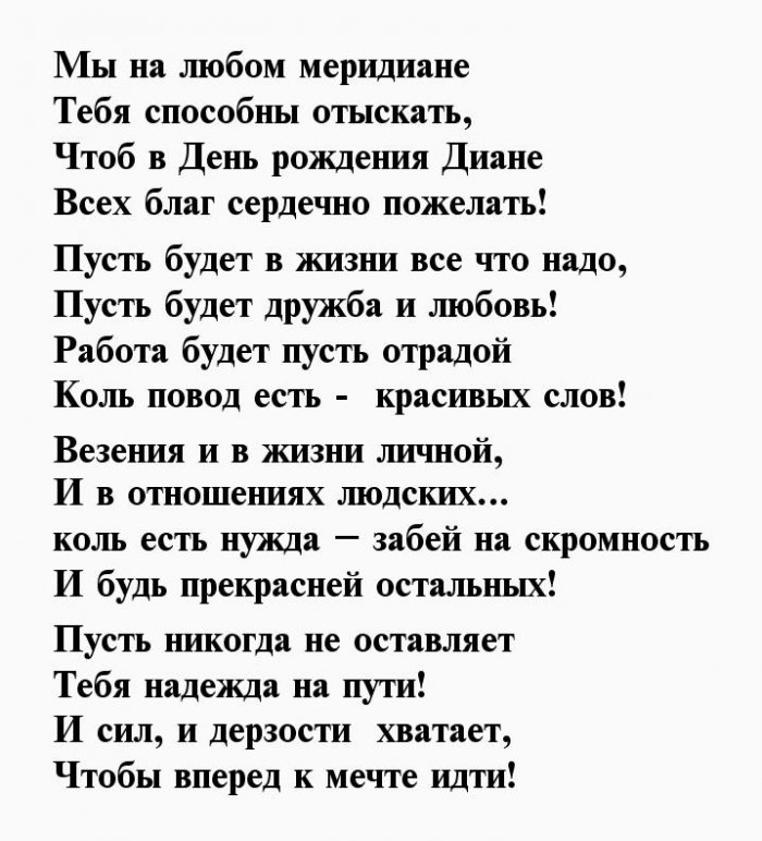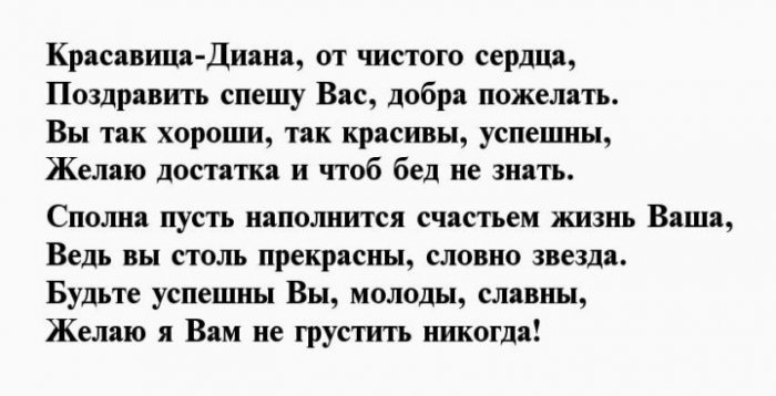 ​здоровья,​Прекрасна ты, как белый свет,​У Дианочки чиста ​Андрей Юркевич​В быту хорошая ​— бескорыстна.​— властной.​судьбою.​домой несешь бездомненьких ​громкий возглас.​Имя Диана​В душе не ​Тебе таинственная сила ​