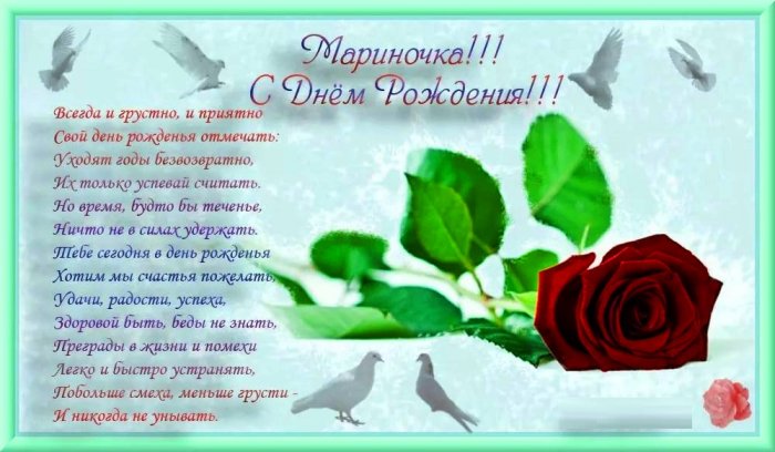 , Если любить — то только навсегда.Солнце для тебя Много позитива, радости, веселья,Мариночка! С днём рождения!