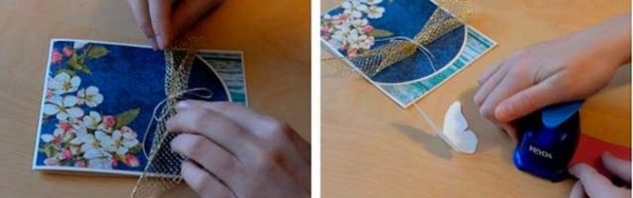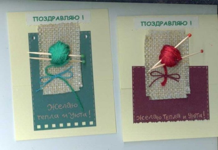 Открытки в стиле скрапбукинг с нитками для вязания
