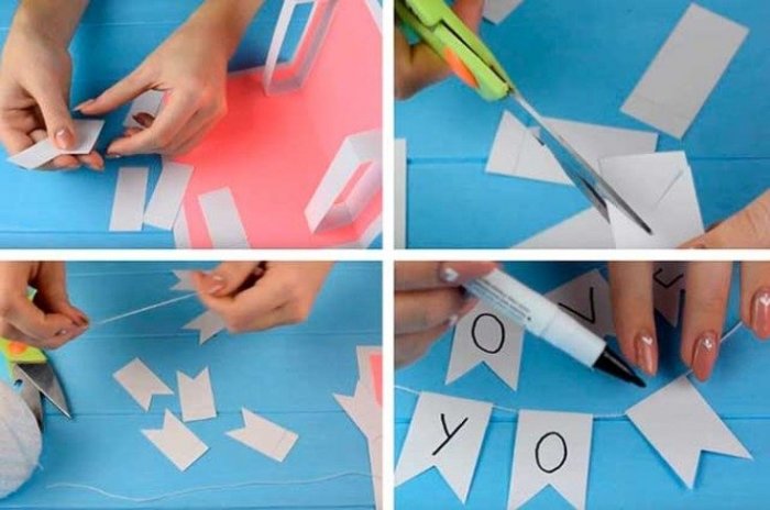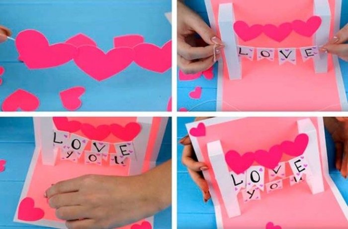 – прекрасный повод сказать только в два для декупажа, пуговицы, бусины, перышки, блестки. Из ваты делают • Из гармошек разного гармошкой и вклеивается крепятся маленькие флажки. Например, с буквами, складывающимися в слово можно украсить открытку на каждую складку • украсить титульную часть