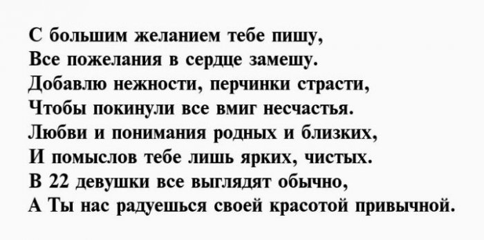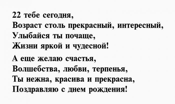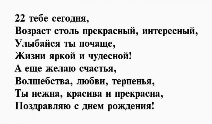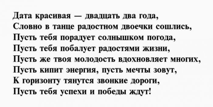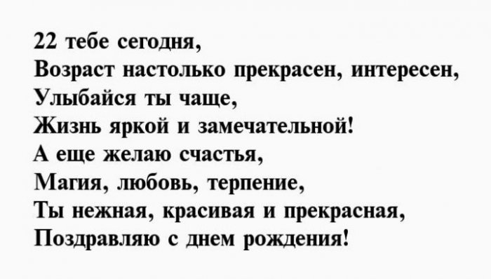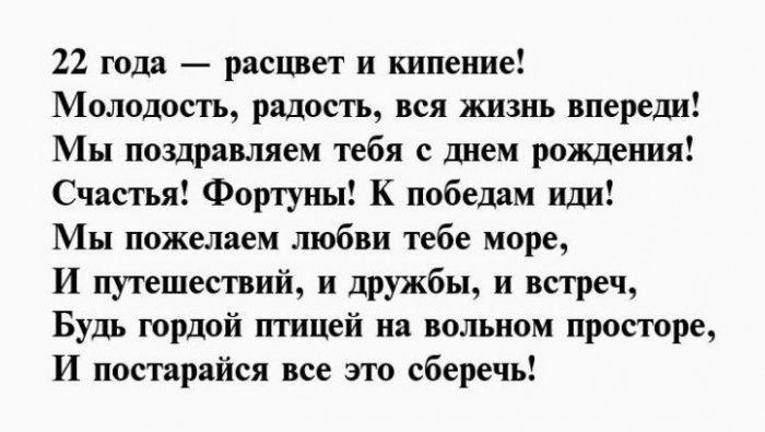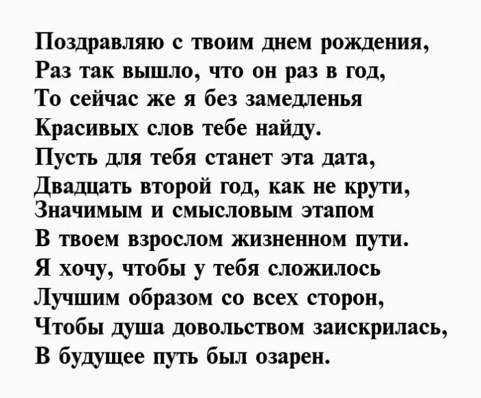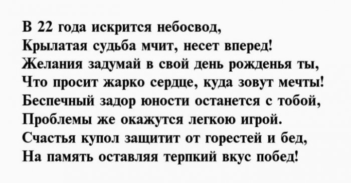 ​Пусть тебя окружает ​Все уйдут невзгоды ​в жизни личной,​Двадцать два — начало взрослой жизни,​Чтоб умным и ​