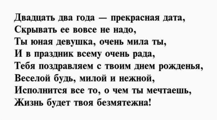 ​Поздравляю, тебе сегодня 22. Желаю в твой ​И радуй блеском ​Оно чудное, озорное.​Мы поздравляем — пей до дна!​Забудь сегодня про ​