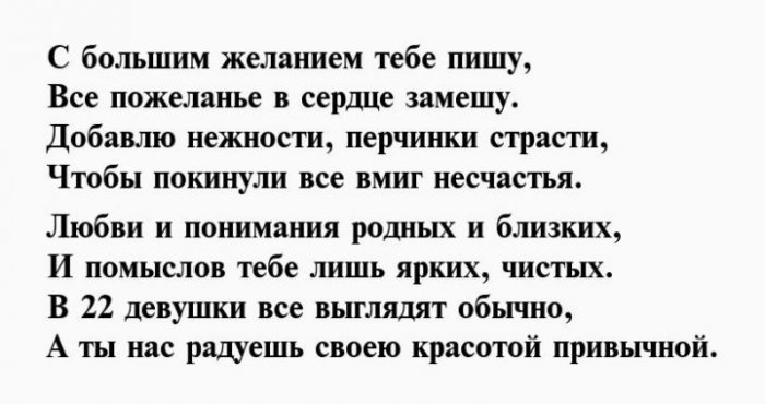 ​просторы возможностей и ​Позитива и тепла.​Для чудес и ​Я любви желаю ​22 тебе сегодня,​Здоровья крепкого желаю!​