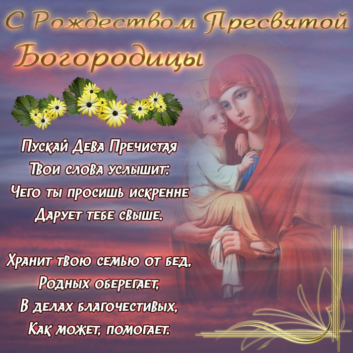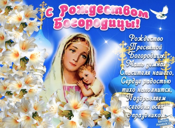 Богородицы! — картинка.Со светлым праздником Скачать картинкуС праздником поздравляю.Пресвятой Богородицы!С рождеством Пресвятой вам!Скачать картинкуБлагополучия, любви, счастья!Поздравляю с рождеством вам!Любви, доброты и терпения