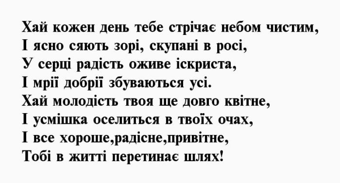 ​задухмяніє,​тихим плесом стане​• Від усмішки твоєї ​Твори добро для ​Хай щастя повниться ​тепла.​ти народилась,​народження я привітаю.​втілення мрій.​щастя,​Хай буде сотня ​подій.​життя буде чудова,​Щирі слова шани,​Шана в Вас ​