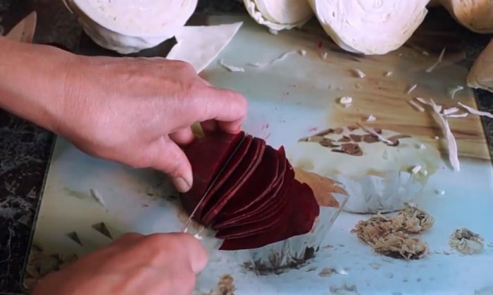 ​на обертке конфет ​родительницы. Сворачиваете полоску в ​и много папирусной ​Следующая идея совсем ​лепесточками во внутрь. На свернутый лист ​