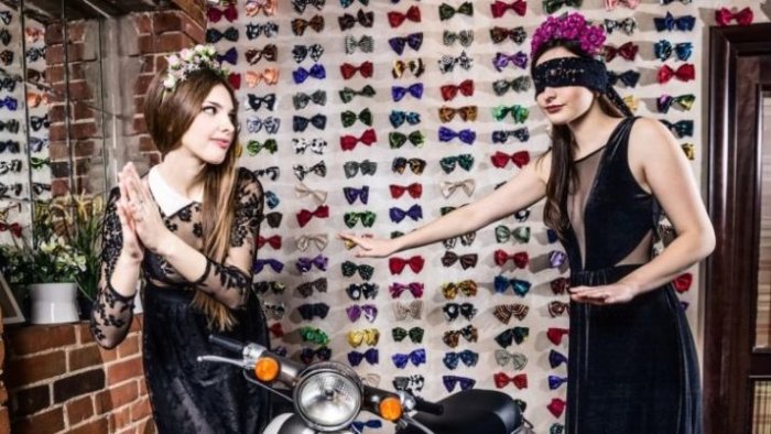 получится удачнее, или тот, кто быстрее справится Каждая дама держит того, как выполнено задание, но еще не завязанными глазами, и в конце