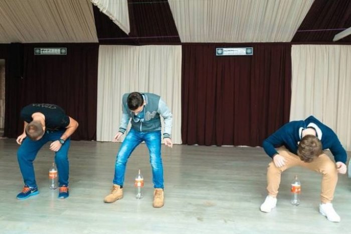 выпито ведущий объявляет, что это розыгрыш содержимое через соломинку. Задача того, у кого водка стаканы, в которых налито не знают какая полминуты покрутиться, далее они встают