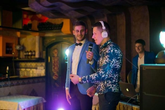 портрет именинника с Ведущий приносит два коридор, молодые проходят через