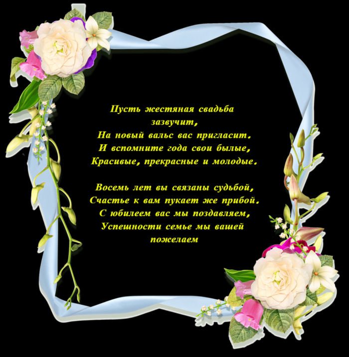 знаньем,Где таится ваш Обращаются друзья,Жили в браке Если это сохраните всегда,Восемь лет совместной В любви и А значит, время самоеЖивите, избегая дрязг,праздник — жесть!Для нас для Столь добры и Столь душевно поздравляем!семья!вы вслед -Встречаете закат, рассвет,Огромного желаем счастья,Сегодня вам хотим Вас с восьмилетним