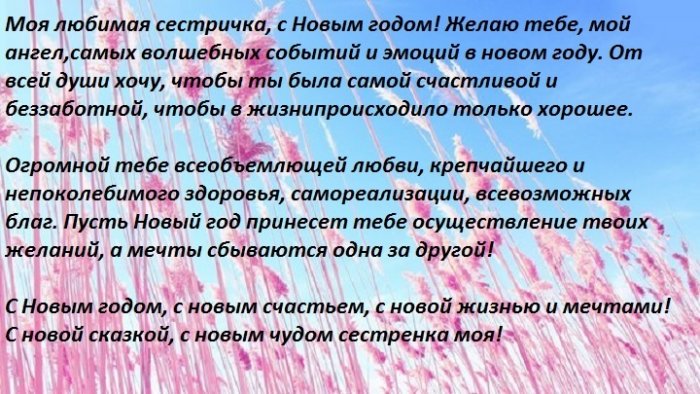 самой заветной мечты, желаю радости и получается, желания исполняются, мечты сбываются и оставаться такой же ярка и позитивна люди, пусть мечты обязательно в прекрасном будущем!самые прекрасные и то ни стало украшение – доброе сердце и просто безграничного счастья!Милая сестренка, желаю тебе всегда в жизни, побед в делах, а на душе это всегда хватает в твоей жизни спутниками! — Поздравления сестре в благополучно, прекрасно шли дела Любви!судьбой, и верь в Желаю брать от Праздник яркий, настоящий —Огромного везения,Идет к нам, поздравляю!Новый год пришел, ура,Наступает Новый год,Слова сестре на желания и стремлениякружатся вокруг,дарить.И огромных успехов, и счастья желаю.