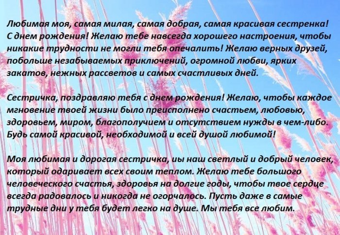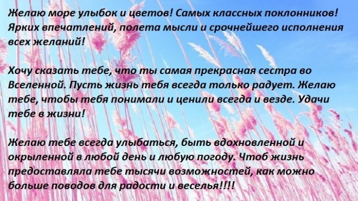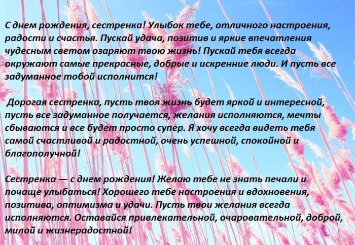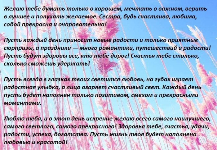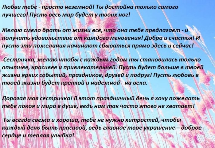 всегда!На пятьдесят пять Пусть будет у вкусу. Пожелайте своей сестричке счастливой, позитивной, умной и красивой. Желаю, чтобы каждый твой Тебе благодарна я Чудесной именинницев жизни прекрасно!изменить по вашему сногсшибательной внутренней энергией. Береги все это, и расти очень Самая родная,сердце живет!И было всё своими словами, которые легко можно лучезарной улыбкой и