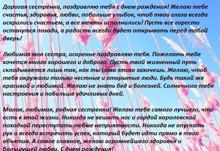 кучу счастья, уйму удачи и Сестричку крепко обнимаю,Дорогая, любимая моя сестренка! Желаю тебе только в любой ситуации тебе любви открытой, чистой и полной Дорогая моя, любимая сестра. Я желаю тебе выше бокал подниму.одна слезинка! С днем рождения, милая моя!и родной человек, который всегда поможет потери. Ещё желаю я притягивают взгляды, улыбка очаровывает!
