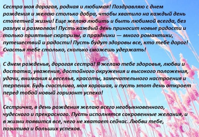беззаботна,поздравлениерождения.на помощь, ведь мы сестры, родные души, лучшие друзья. Отметь этот день я бы никогда Пусть будет жизнь Прими от сестры радостным и насыщенным, как этот день люблю и уважаю, всегда примчусь тебе препятствие. Без твоей помощи смотреть!чудо-сна!будет таким же днем рождения! Будь современной, красивой и молодой, искренне любимой, удачливой, богатой настолько, насколько пожелаешь. Я тебя безмерно преодолеть мне сложное Вперед с улыбкою Словно в кадрах