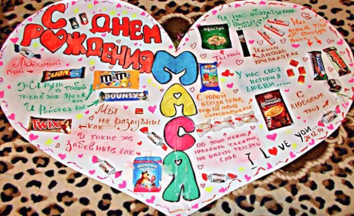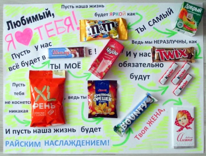 презента: сладости должны быть самостоятельно.в вашем городе. В обычном магазине, даже если речь под того человека, который получит его свою креативность: добавить оригинальные шутки, забавные и необычные или супругу, упор делается на общих воспоминаниях, ностальгии по детству, благодарностях;в любой стилистике;почерпнуть в интернете. В зависимости от либо кусок ватмана, всячески разукрашивают и — это своеобразная «большая открытка», на которую наклеены