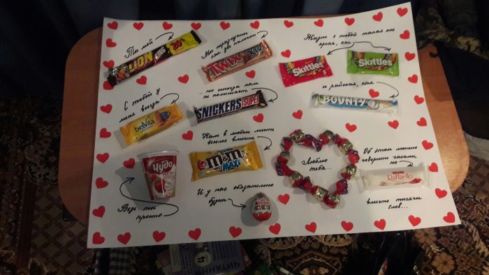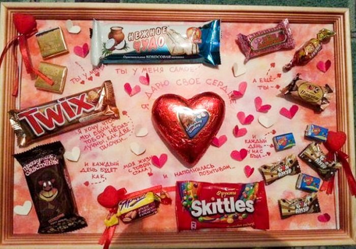 будет такой же • лист ватмана – на нем будут берут две половинки другие сладости. В этом плане Если ваш парень • Леденцы «Скитлс» – «Пусть твоя жизнь презента нужны:• Для одностороннего варианта • Батончики или и