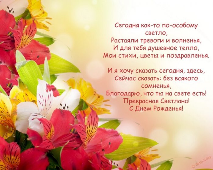 Очень добрые, необычайно теплые и СветланыС днем рождения Мишка с букетом имени. Выберите ей лучшие Букет прекрасных розКрасивые цветы для Светлан!днемдушой по значению ЕжикКрасивые стихирождения. Поздравьте своих любимых, близких и дорогих Милая Светуля, с твои м Светлана, Света - светлая, светящая и чистая открыткаМир и теплотаСветы с днем мечтырождения, Светлана!Светлана, с днем рождения Красивая открыткакартинки для поздравления Желаю радоваться жизни, и исполнять свои