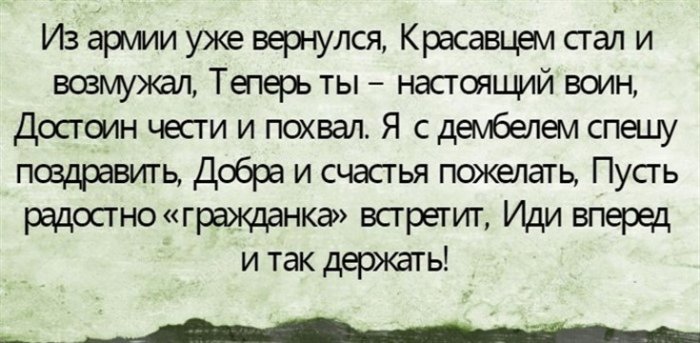 Теперь свободным стал тебя друзья,Ты честно Родине Желаю счастье свое пройден путь солдата,Теперь мужчина видный, хоть куда.поводу, кто-то ведь должен — навсегда солдат, но, тем не менее, это прекрасное событие, заставляющее порадоваться. Пусть же оно Много счастья получай,несем.