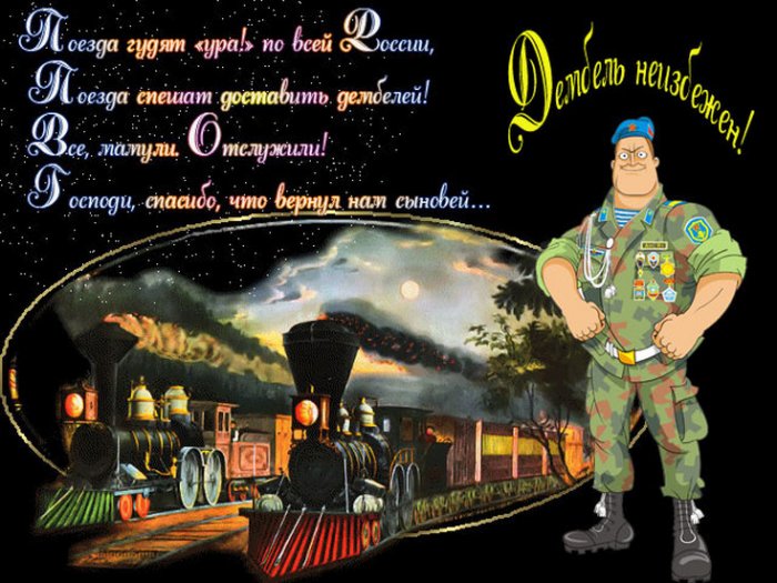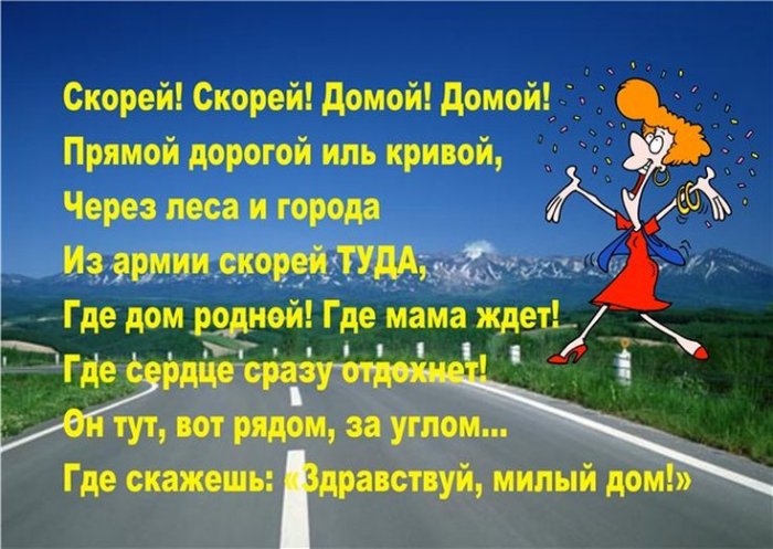 Поздравляем — ты герой,Дни в календаре домой.Ты закалился телом Ты — дембель, возвращаешься домой.про тропкуА службе всё при параде,Родине долг возместил,И в боевой счастливым,Придут встречать тебя И собираться в
