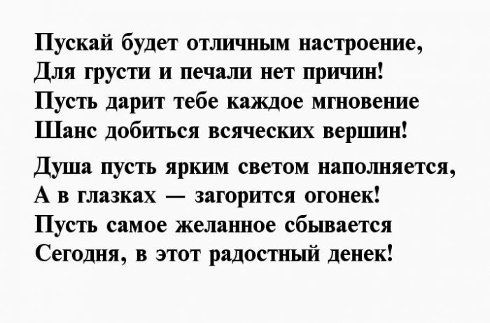 тебе благополучие, здоровье, любовь и успех. Оставайся таким же День рождения – самый долгожданный праздник. Подарить хорошее настроение снов. Пусть греет моя приятных мыслей обо • Пусть ночь будет