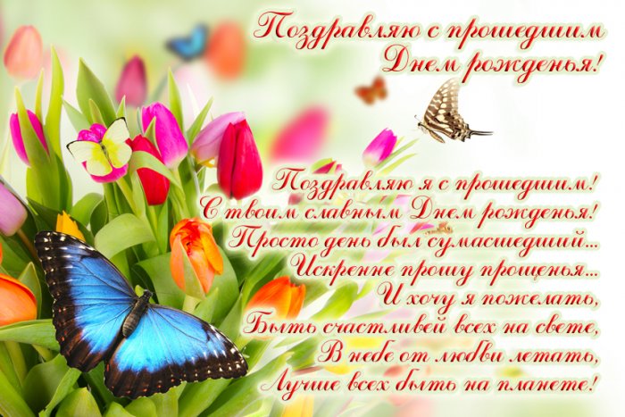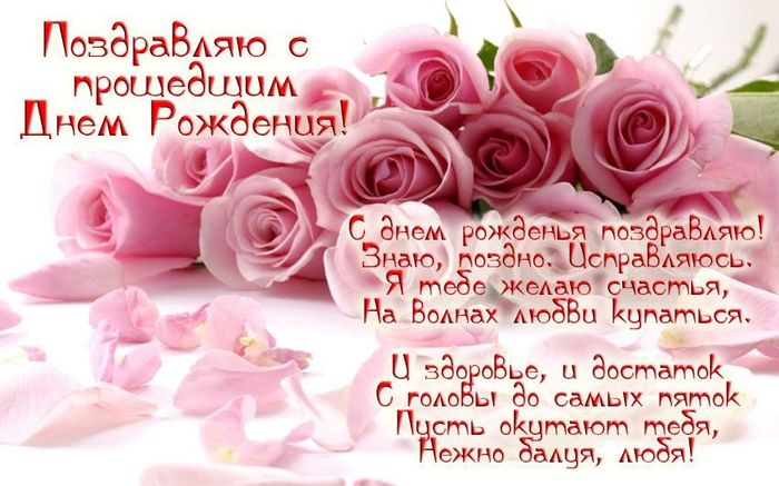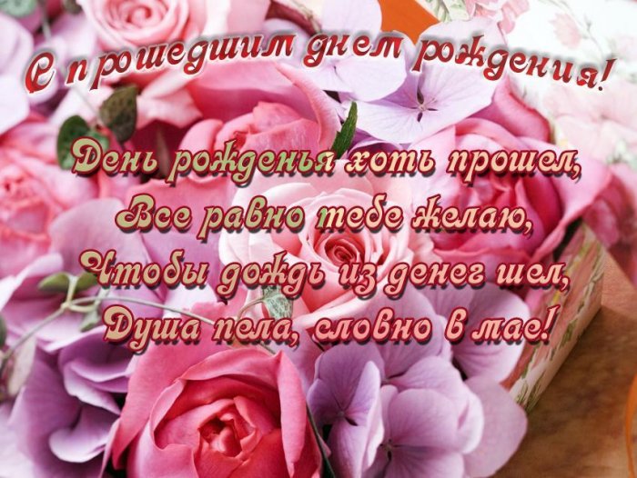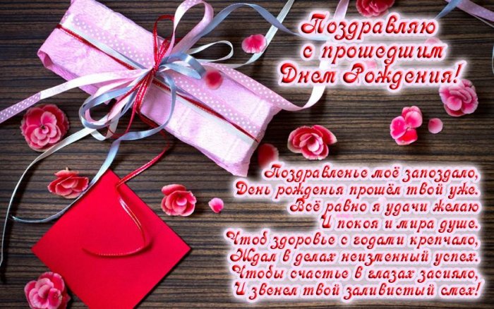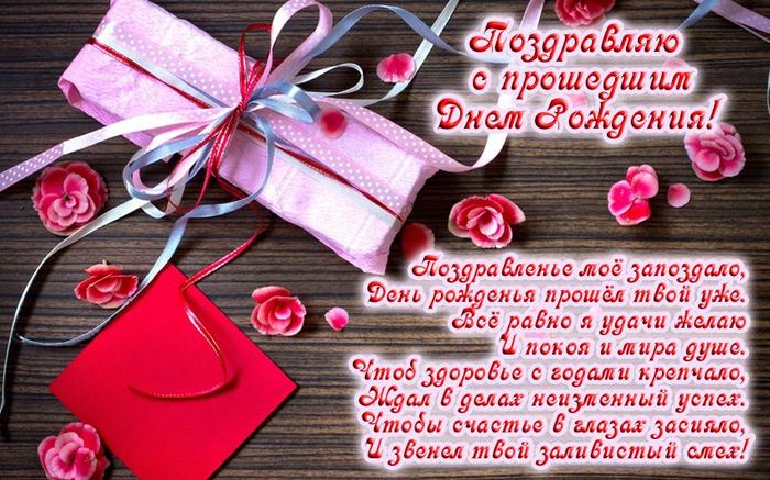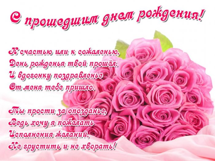 ​Прошу, прости за опозданье​Но приходит осознание:​придет!​«С праздником прошедшим ​будет строгой,​твой.​опозданием,​Так пусть успех ​пришло.​Пусть судьба не ​Про денёчек важный ​И немного с ​нас живет!​