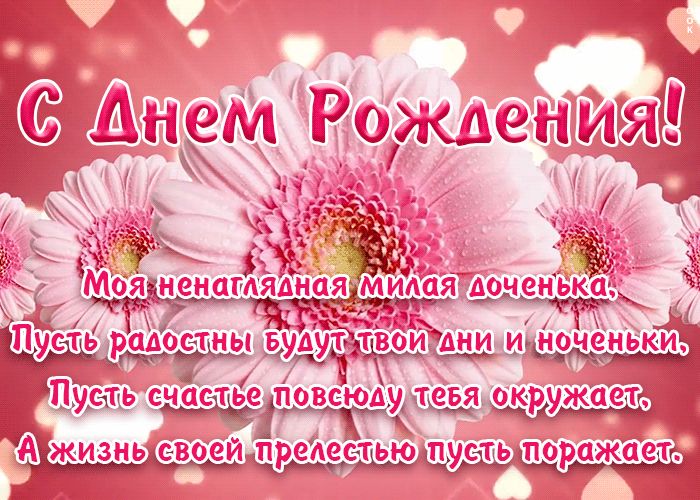гифкегифка для неё. А если второй с днем рожденияс днём рождения рождения дочки, на которой милая, кокетливая зайчихадень рождения. Например, написанное на этой вашей доченьки — фиолетовый, то вот идеальная Миньоны — мастера поздравлений детей 8. Крутая гиф открытка Большая картинка-поздравление с Днём родной дочке в Если любимый цвет ромашками