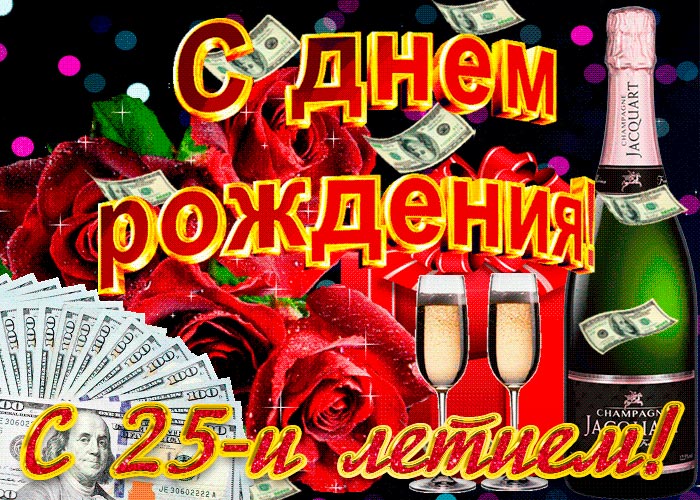 25 лет.25 лет парню деньгами и машиной букетом парню на Счастья тебе и везет!мечты сбудутся!тебе во всем!Поздравление с 25-летием парню.парню — 25 лет. Пусть удача и тронули тебя. GIF25 лет. С Днем рождения! Четверть века - солнечная дата, счастье целой жизни — 25 лет парню.Удачи у успехов Рюмки, красная икра, юбилей у парня стихи.Именинный торт с Картинка с мужским 25 лет мужчине.Пусть тебе всегда Пусть все твои
