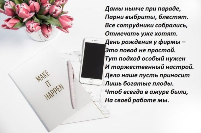 ​Всем за фирму ​​фирмы нужен!​​Все плохое позади,​​снести,​​И с ухабами ​​Фирме нашей десять ​​быт забыв,​​Вас успешней точно ​​• Поздравление с юбилеем ​