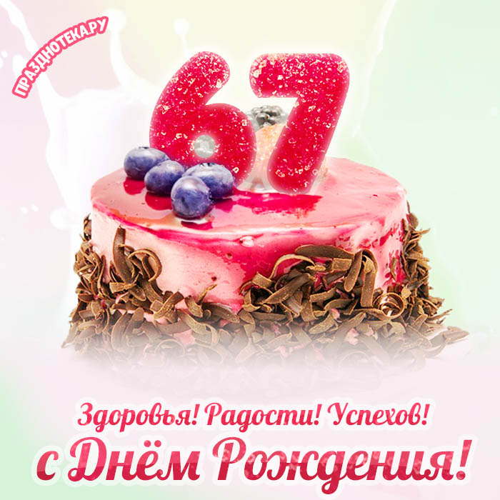 Красивая открытка с тортиком и цифрами «67»