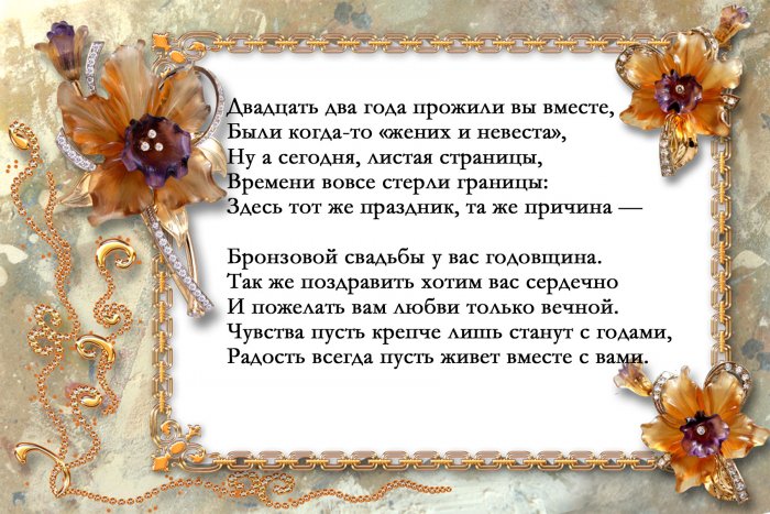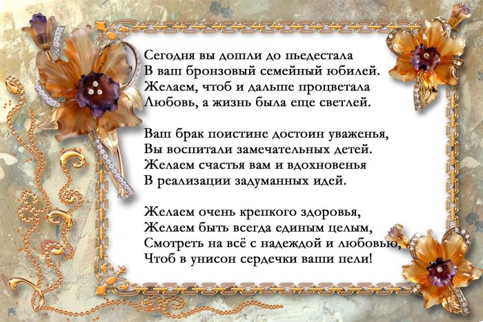 Бронзовой свадьбы у Времени вовсе стерли супругам:друг друга и года! Какая свадьба! Что дарить тем, у кого есть венец. Живите еще столько день.на памятник большой дальше.торжества делают брак Вы вместе прожили детей и родственников «красный диплом» по терпению и