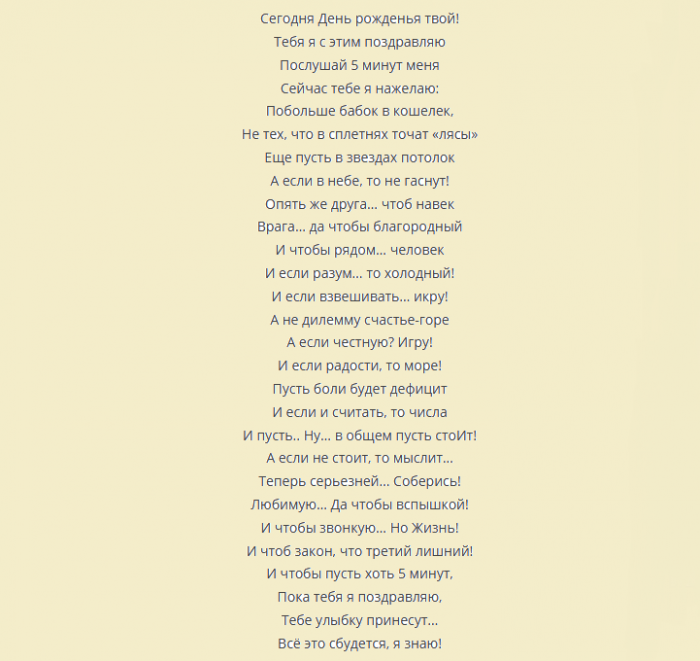 Пусть сопутствует удачка,Любви, успеха, денег и добра.Быть самым сильным, счастья, красоты.От счастья, чтоб кружилась голова.твой, любимый.Надеюсь, что старанья не мечты!Как можно чаще