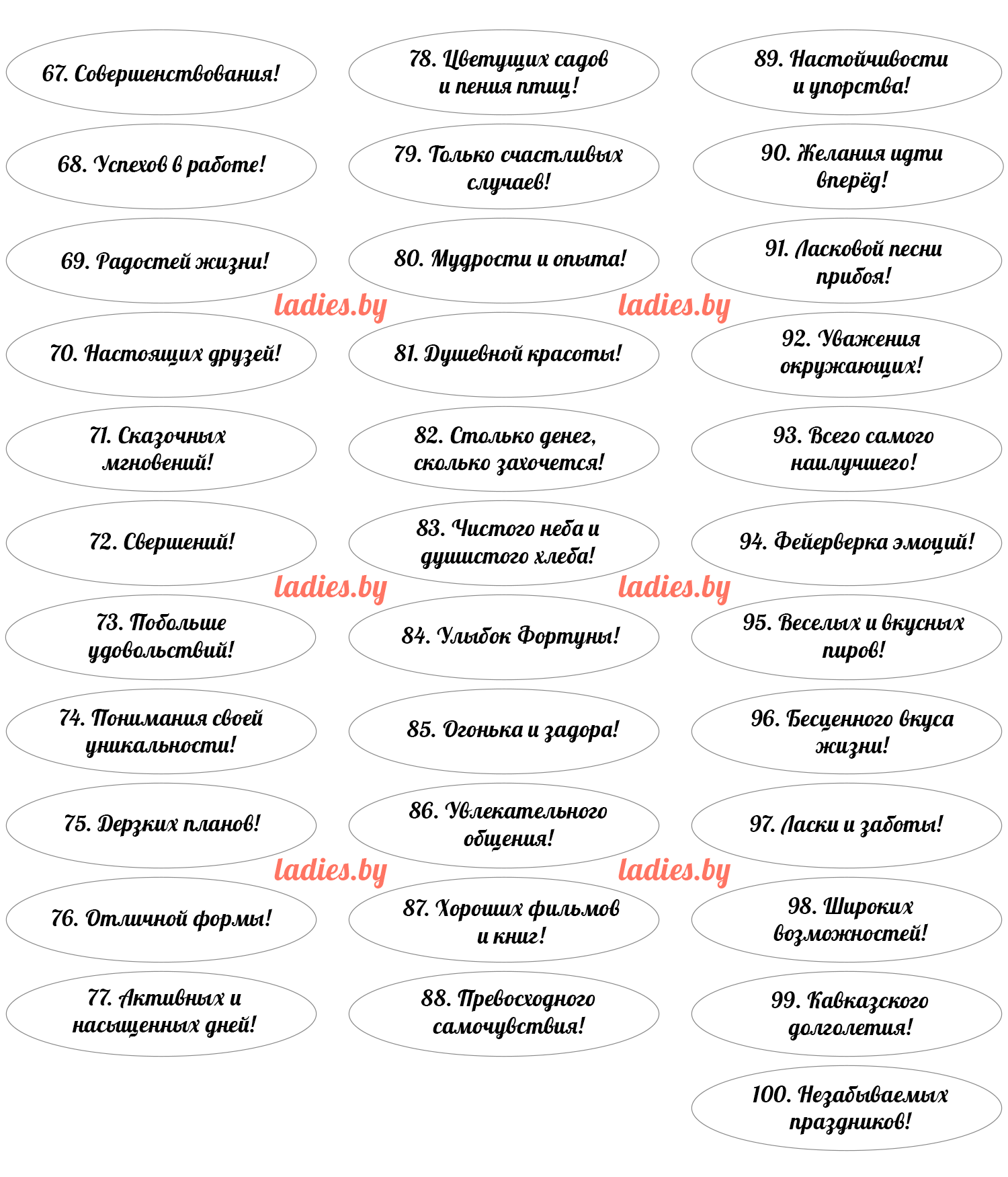 5. Светлой судьбы!пиров! 96. Бесценного вкуса Ласки! 97. жизни и заботы! 98. Широких возможностей! 99. Долголетия! Прекрасного. 100 праздника!!!событий! 60. Любви! 61. Жизнелюбия! 62. Крепкого здоровья! 63. Исполнения всех Хорошего! 64. желаний настроения! 65. Душевного спокойствия! 66. Благополучия во Процветания! 67. всем! 68. Успехов в работе! 69. Радостей жизни! 70. друзей Настоящих! 71. Сказочных мгновений! 72. Свершений! 73. Возможности расслабиться почаще! 74. Понимания своей уникальности! 75. Дерзких Отличной! 76. планов формы! 77. Активных и насыщенных