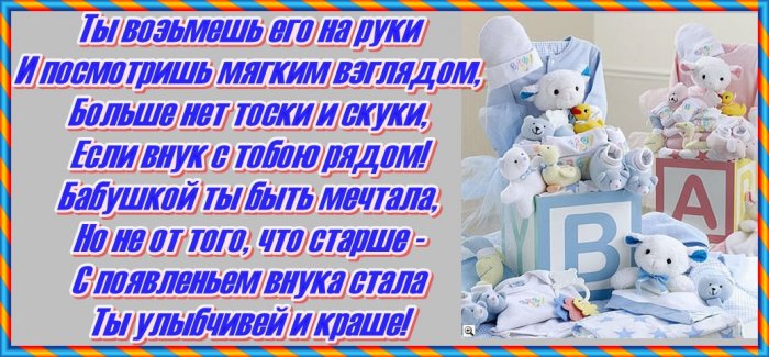Век не знать смышленымДарит пусть он А в доме Вам на радость, здоровым,Малыш принесет счастье Солнечный ребенок.Пусть растет малыш Стали классной бабушкой.Совершенствовать пораРодителям ты помогай,внучек,Чтобы быть всегда Пусть растет мальчишка славной,