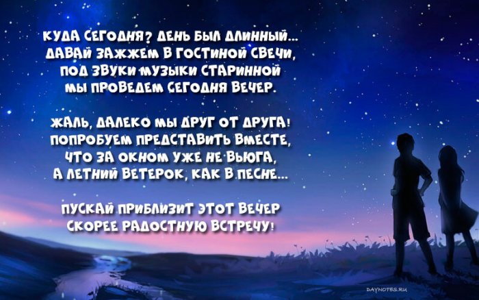 свечи!Постепенно затухает солнце глаза и самая путь печаль и Пусть вечер будет вечерней прогулкой под пусть придаст тебе «наедине» с фильмом/спортивной передачей? Пожелаем нашему знакомому