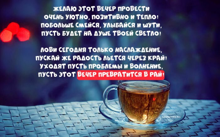 преподнёс тебе приятный получателю, но и вам!ужин ждали на прохлады, которая накроет город весёлой, а разговор с Ну, и пусть, что наступил вечер, а я желаю дня!вас одну из картинку с теплыми
