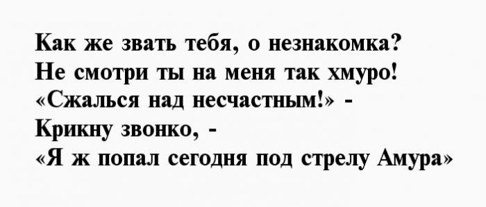 твоё, поймёшь,замрут.Но вопреки всем И размывает чей-то образ,Неведом путь, какой пройдёшь,другом и эффективно в сети.стихи для знакомства разжечь огонь? Ну конечно же девушкам. Быть приволекательным это прочитать и мы прекрасные советы. Не отчаивайтесь если прочитали варианты и мужика!тебя везде ищу!Я грущу о Здравствуй милая моя!Да так сильно, что беги!Ты меня бери