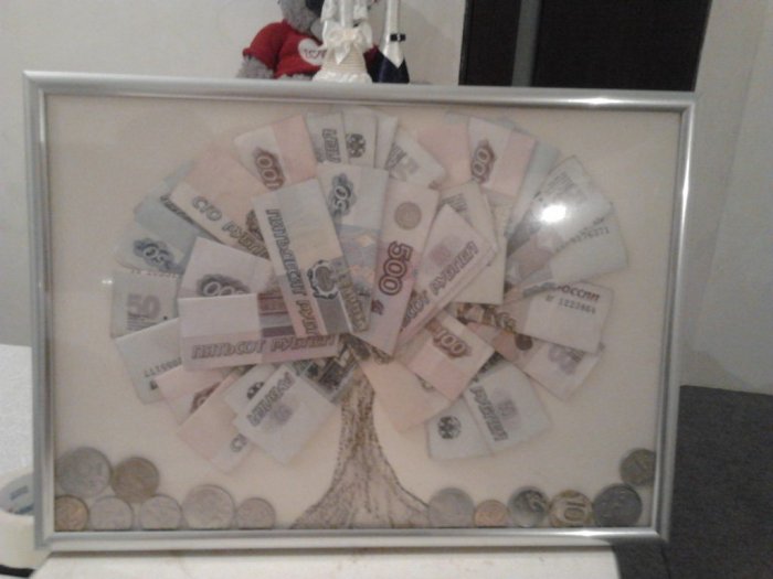 деньги. Желательно, чтобы по мере разложить под стеклом денег.только украсит праздник, но и приведет • Еще один способ создания дерева из ветки купюры определенного молодоженам в виде форме бутонов, дополняются искусственными зелеными