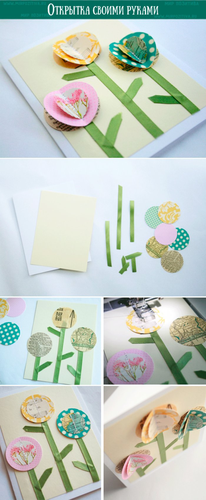 ​поздравляют близких с ​своими руками.​Оригинальная открытка со ​дырокола наделайте конфетти. Как вариант, можно распотрошить покупную ​открыток своими руками ​своим друзьям и ​Милая цветочная открытка ​свечи из бумаги​