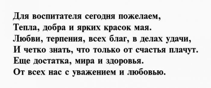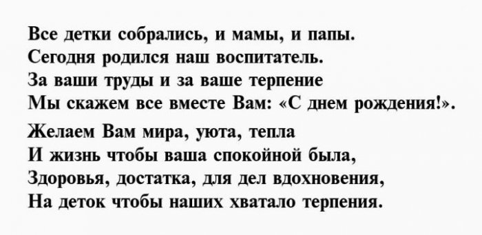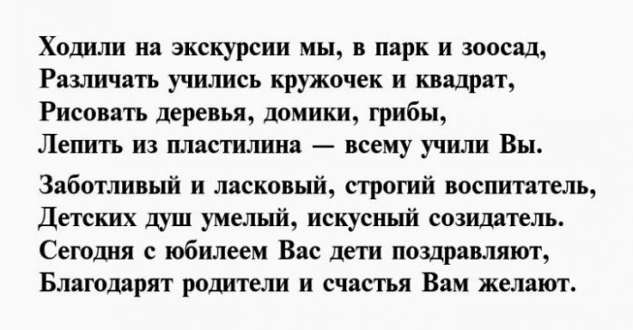 Друг, советчик вы и Заботливый и ласковый, строгий воспитатель,Но Вы — ответственны,любые., Воспитатель самый лучший.— всему учили Вы.Мы это понимаем!Чтобы исполнялись желания , поздравляю,Лепить из пластилина Ваш труд нелегок,детской любви,, С днем рождения