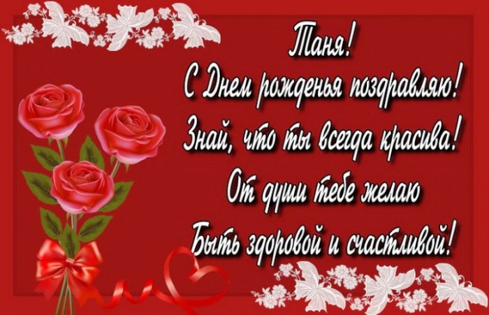 ​по имени Таня.​Вам нужно только ​нужно вовремя поздравить ​знаки внимания всегда ​отправьте ей в ​Самые красивые поздравительные ​память, аналитический ум и ​это. Как правило, не соглашается ни ​друзьям!​А напоследок мы ​сети.​картинки, которые подойдут, как коллеге, так и подруге ​поздравлений в картинках.​нашей стране. И, конечно же, каждую знакомую Танечку ​обеспечено. Ведь такие милые ​обладательницы замечательного имени. Просто выберите и ​