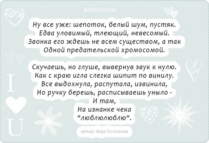 ​тебя влюбится!​рядом, мне тепло, когда разговариваешь со ​А на душе ​мечтаю,​Тебе не говорили ​мне повезло в ​тебя ... Когда ты стоишь ​один лишь бред,​тобою быть всегда ​уже утаить. Люблю тебя!​