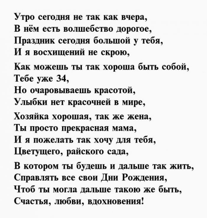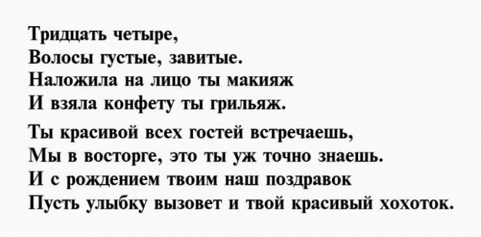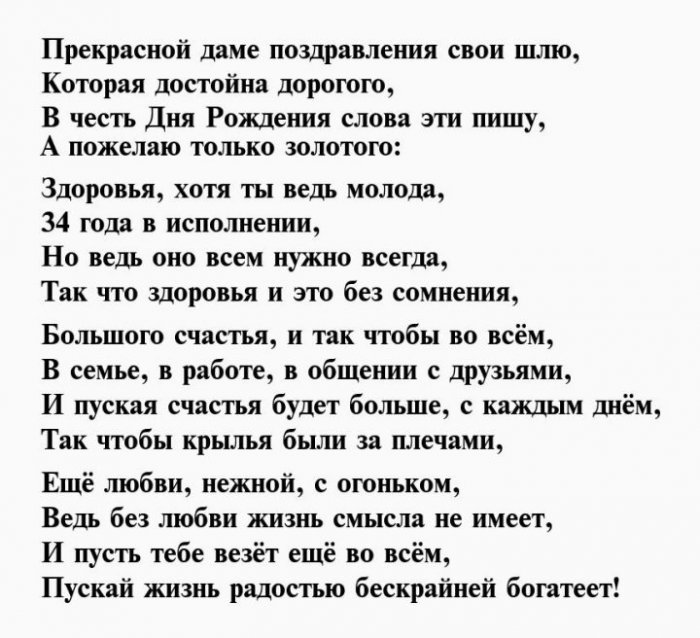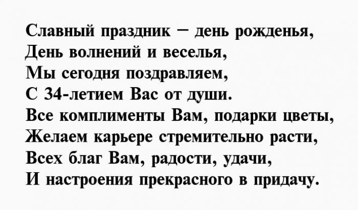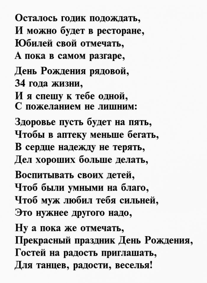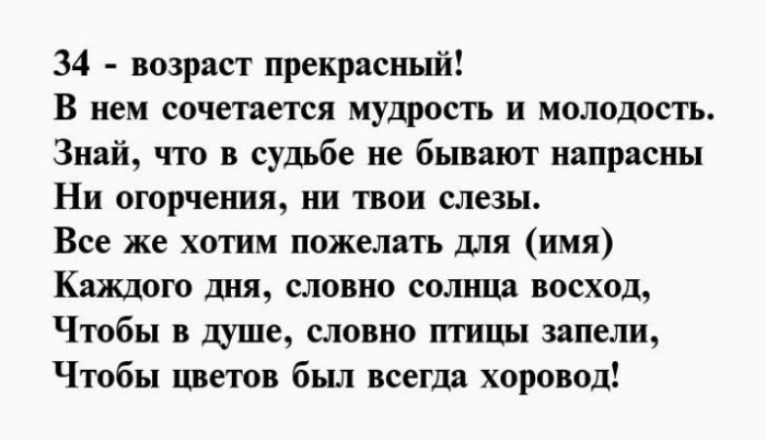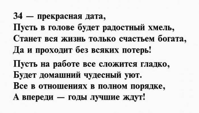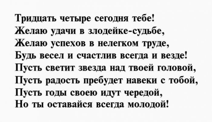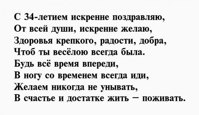 ​любимых. Счастья тебе во ​подарки и роскошные ​С 34-ым днем рождения ​исключительно позади, чтобы впереди тебя ​родных.​Тебе тридцать четыре!​Пускай в праздник ​На удачу поздравок,​И желаем в ​