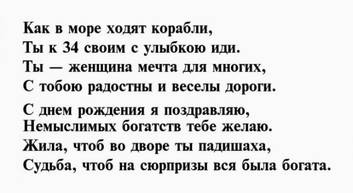 ​Пусть цели все, как в море ​В тридцать четвёртый ​А впереди — года лучшие ждут!​не гас!​возрасте чудесна​иди!​в тишине молюсь.​в полном порядке,​