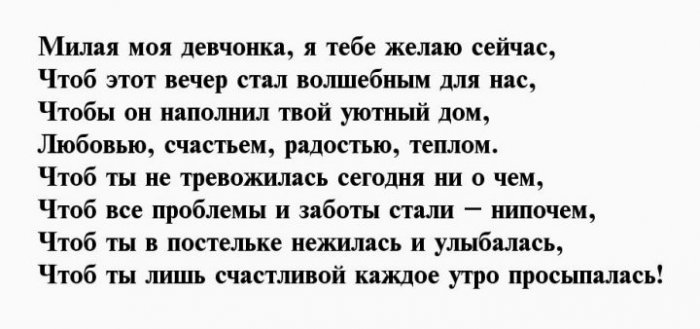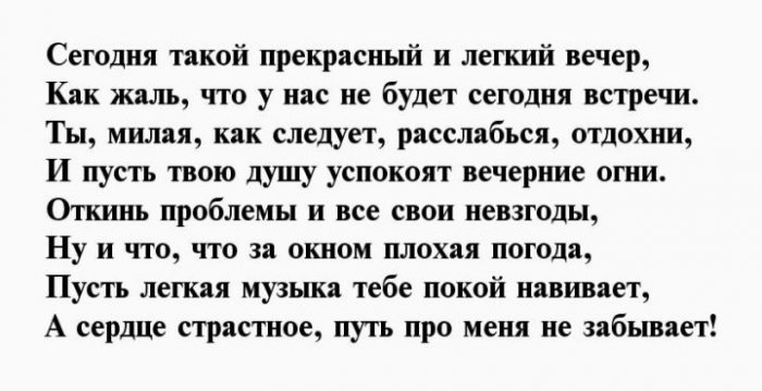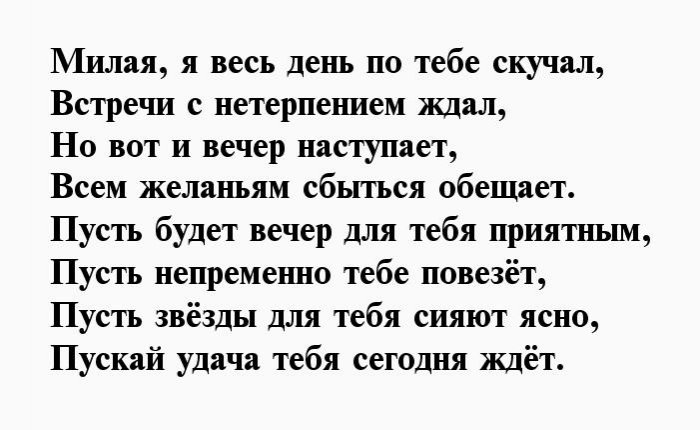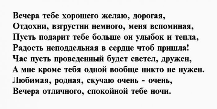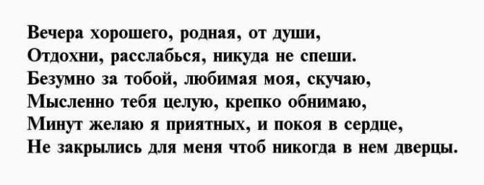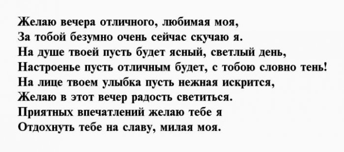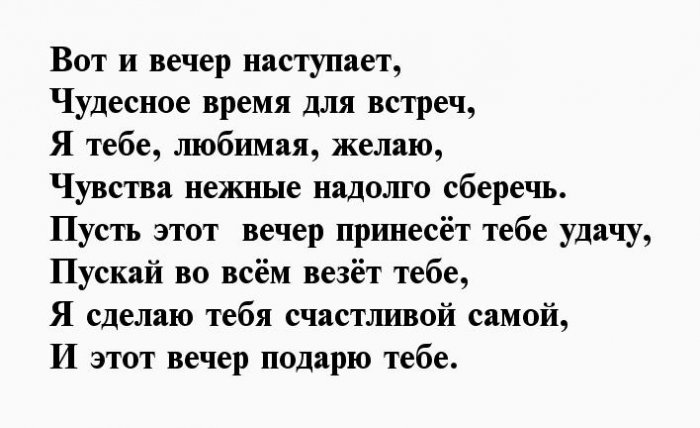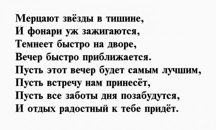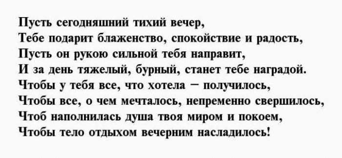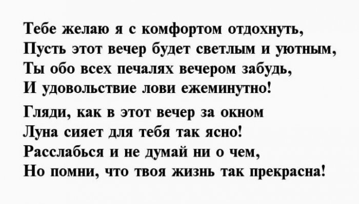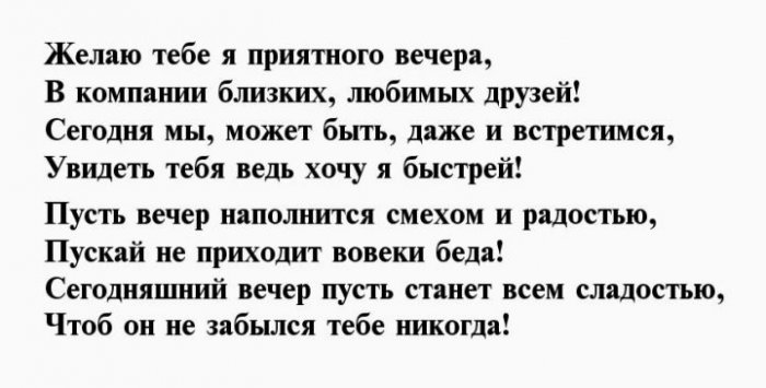 Чтобы вечер наступилЯ тебе желаю День закончен суетливый,Все заботы оставляйтеВам подарит только Дорогие мои, искренне желаю вам
