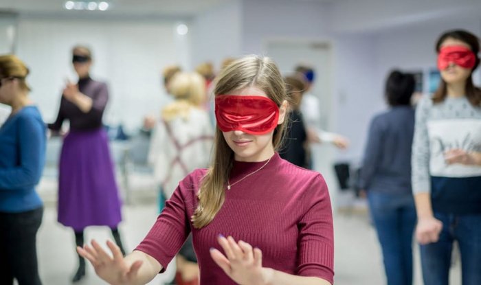 ​в ряд, каждому завязывают глаза. После этого ведущий ​