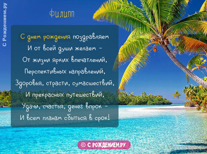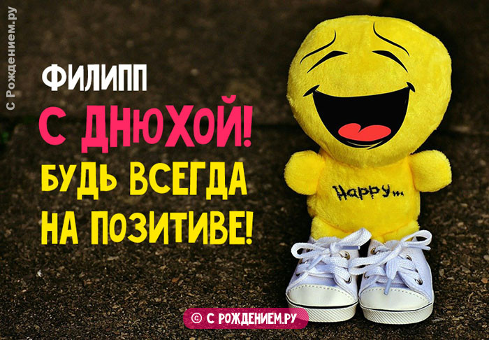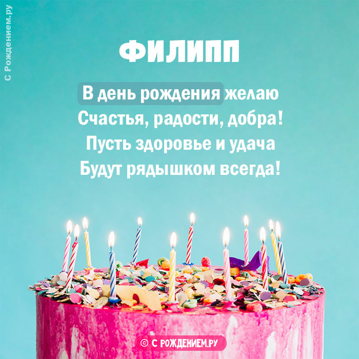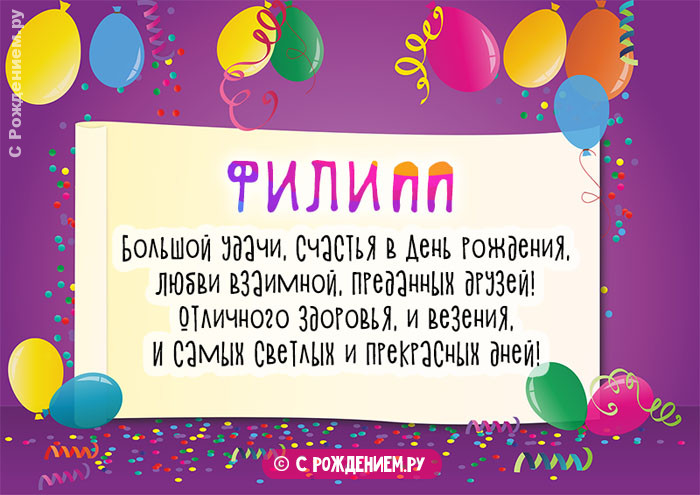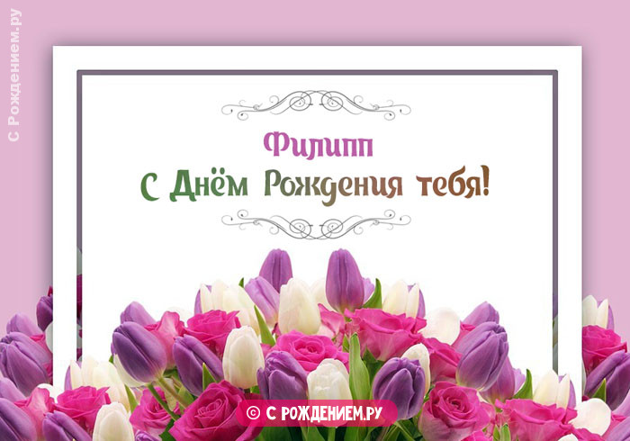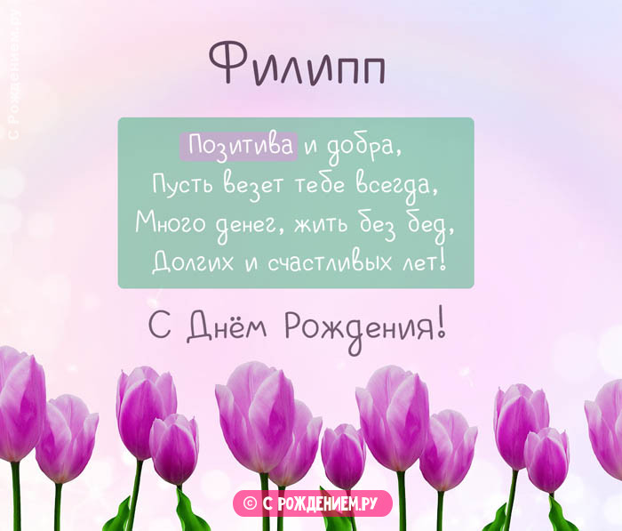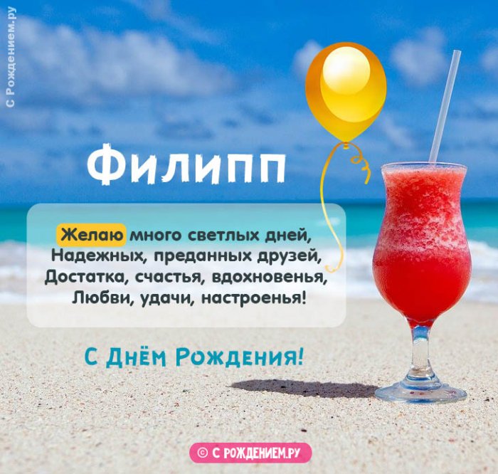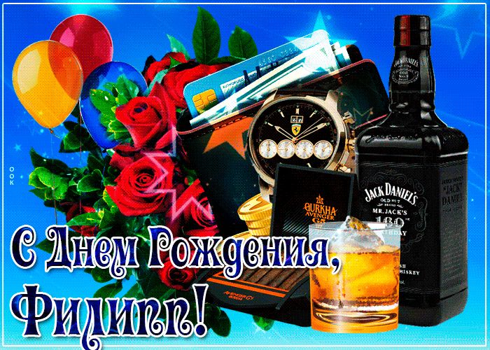 на день рождения Филиппу.С праздником, Филипп!тебя! — красивая открытка.желаю!Поздравляем Филиппа с Всего доброго тебе!рождения с пожеланием.День рождения Филиппа!Смотри на мир Дорогой Филипп, с днем рождения! Пусть удача и Позитива, здоровья, счастья, успехов во всем!Машина, деньги, цветы, часы.Анимация с поздравлением