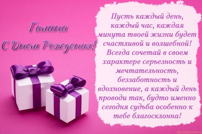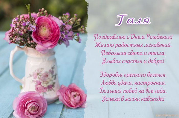 Счастливого дня рождения, милая Галя! Пусть каждый миг твоей жизни будет наполнен радостью и любовью. Оставайся всегда такой же красивой и жизнерадостной!