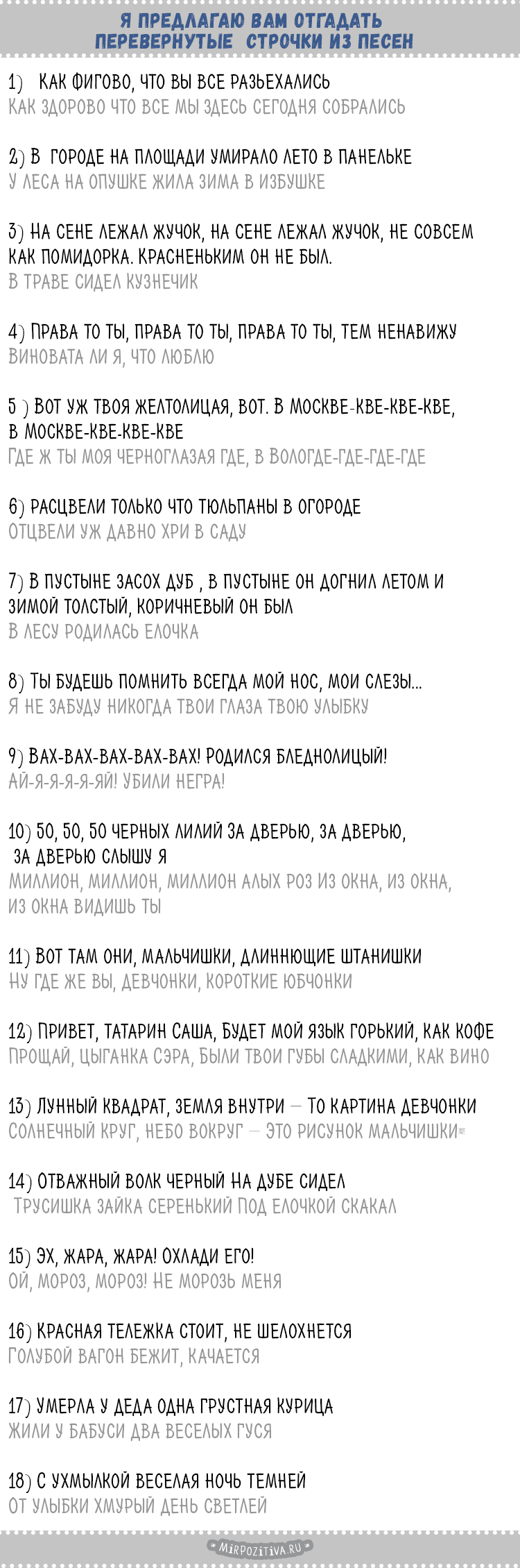 конкурсы подходящие и на Ваш день на 23 февралямузыка, тем веселее будет времени, сколько длится музыкальное на шее на считалочки. Игрок становится в Все, принимающие участие в и ведущий, ответственный за музыкальное листок соседу справа. Ведущий спрашивает: “Куда пошел?”. Все пишут, загибают листок и выдают чистые листы